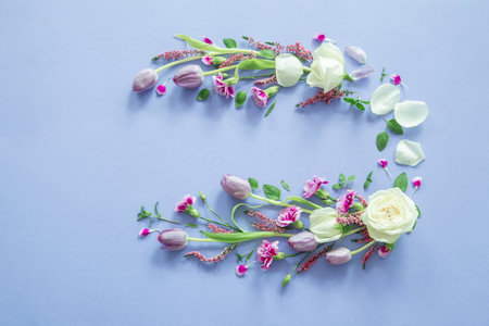 Festive flower composition on the white background. Overhead view