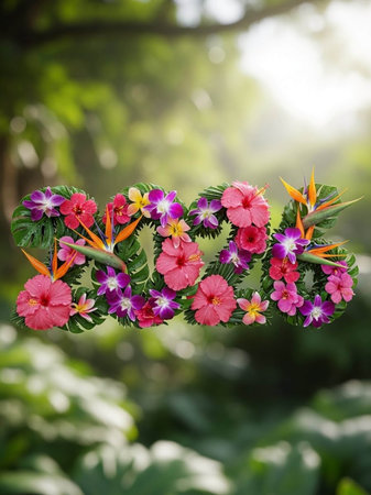 Vibrant torso adorned with exotic orchids against a clear blue sky