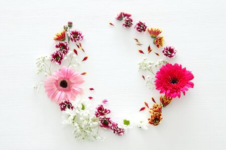 spring bouquet of pink, yellow, orange and purple flowers over white wooden background. top view, flat lay