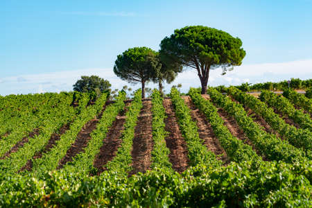 Vineyard at sunset. A plantation of grapevines. Hilly mediterranean landscape, south France, Europe