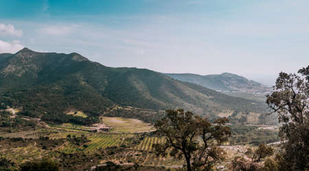 Landscape with mountain peaks in sunset, grape yards in valley. Exotic destinations concept.