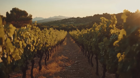 A tranquil vineyard scene captures the beauty of grapevines bathed in warm sunlight during golden hour, showcasing the vibrant greenery and rolling hills.