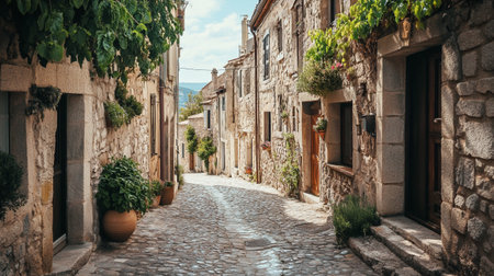 A picturesque, narrow cobblestone street in a European village. Lined with stone buildings, shops, and overflowing potted plants.
