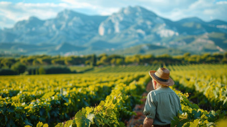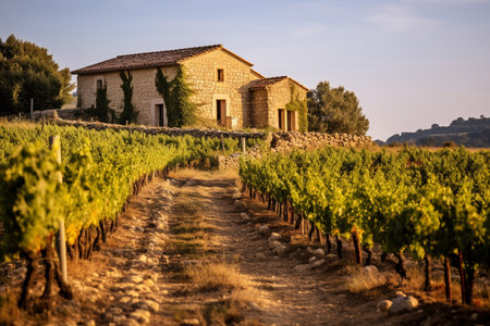 A French farmhouse sits nestled amidst rows of grapevines, with mountains in the distance. The sunlight casts a warm glow over the vineyard, creating a picturesque scene.