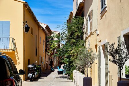 Saint-Tropez, France - September 22, 2018: Narrow street in the old part of the city Saint-Tropez in a good day