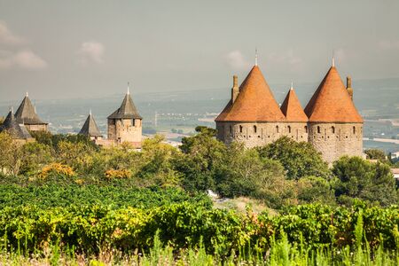 Vineyards growing outside the medieval fortress of Carcassonne in France