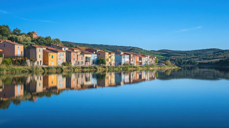 A picturesque riverside village showcases charmingly painted houses along the water, perfectly mirrored by the calm river under a bright blue sky.