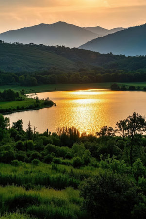 Sunset over a lake in the Tuscan countryside, Italy.