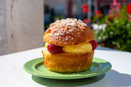 Tarte tropezienne or La Tarte de Saint-Tropez - dessert pastry consisting of filled brioche with cream and fresh berries served outdoor.