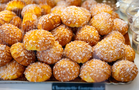 Many Chouquettes or petits choux are small pieces French patisserie consisting of small spheres of choux pastry, sugared and baked, Bordeaux, France