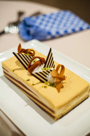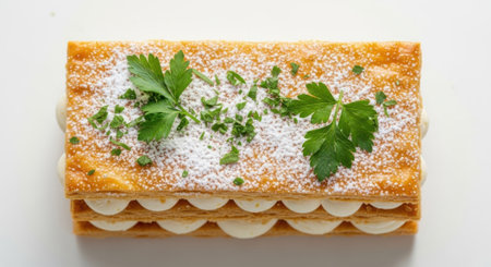 Mille-feuille pastry layered with cream sits elegantly on white plate. Soft natural lighting enhances the delicate layers and textures. Concept of patisserie, dessert shop, culinary art.