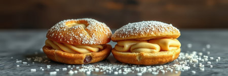 Sweet pastry filled with creamy filling topped with powdered sugar on a rustic table