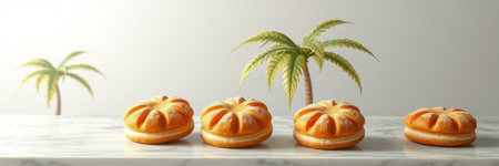 Delicious pastries arranged on a marble surface with mini palm trees in a bright setting