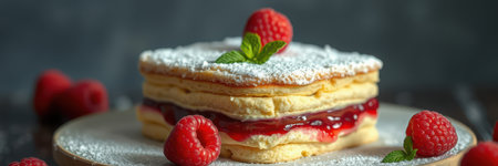 Layers of delicious pastry with raspberry filling and mint garnish seen in a cozy kitchen setting