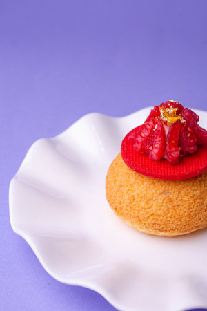 Close-up of dessert with raspberry and gold dust on purple background sweet aesthetic.
