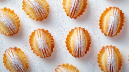 A delightful arrangement of golden madeleines dusted with powdered sugar. This overhead shot captures the intricate details and textures of these classic French pastries, perfect for any culinary showcase.