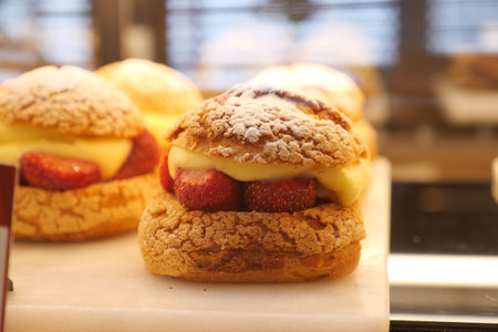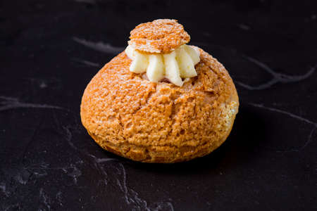 christmas choux cream or cream puff or French profiteroles with fresh cream set on cafe table.