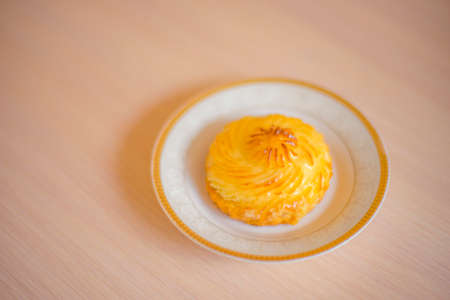 Close up view - delicious fresh shortcrust tart cake with yellow cream for sale on counter of shop, grocery, market, cafe or bakery. Dessert, sweet food and confectionery concept