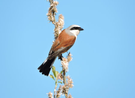 Esser grey shrike (Lanius minor) stands with a raised tail.
