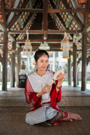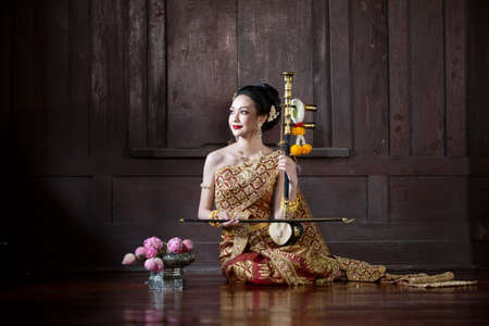 Thai woman dressed in traditional Northern Thailand culture costume with Thai musical instruments. Identity culture of Thailand
