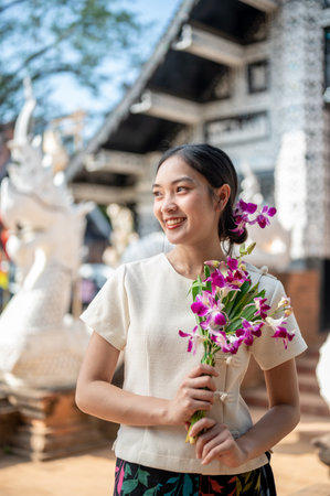 A charming Asian woman in a traditional Thai Lanna dress stands in front of a beautiful ancient temple, holding an orchid flower bouquet, looking away from the camera. Thailand cultural traveling