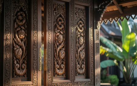 Thai style wood carving on the door in Thai temple, Thailand.