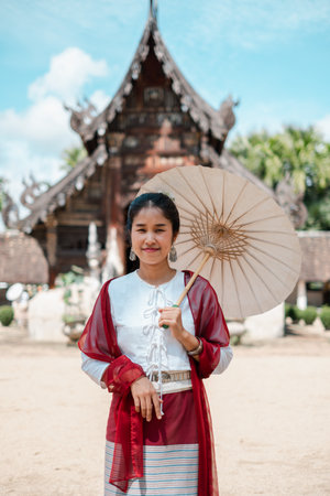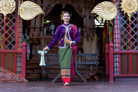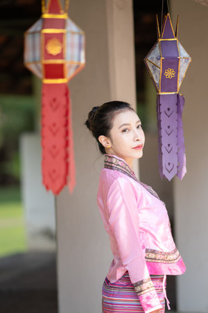 Beautiful young woman wearing Thai Songkran costume, a regional Thai costume dress in Chiang Mai, Thailand.
