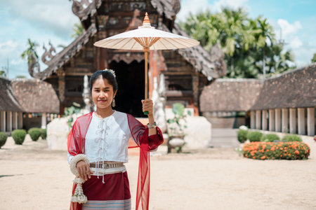 A woman in traditional Thai attire stands with an umbrella in front of an ornate temple, showcasing cultural heritage.