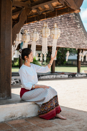 A woman in traditional Thai clothing sits under decorative lanterns at a historic temple, showcasing cultural heritage.