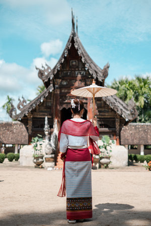 Portrait of Thai female with traditional Thai dress walking with temple background