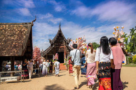 Chiangmai Province, Thailand, 13 October 2022 : Teenagers in Thai northern style costume go to temples to preserve traditions. Men and women at northern Thai temple