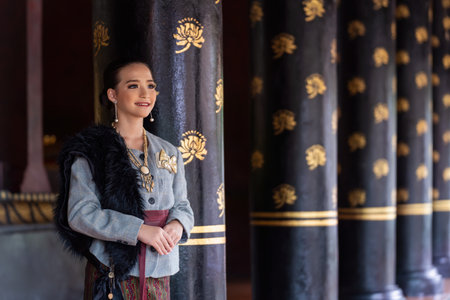 Beautiful young Asean woman in traditional Thai Dvaravati dress in an old temple in Chiang Mai, Thailand.