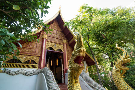 Chiang Mai,Northern Thailand on September15,2019:Finely sculptured Nagas in front of viharn(assembly hall),Wat Lok Molee.