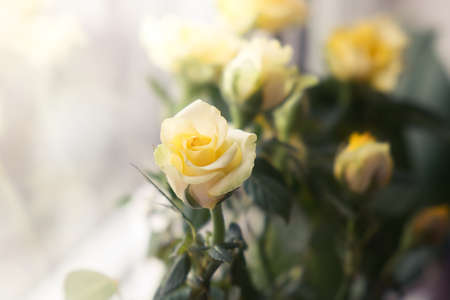 The bouquet of yellow roses on the window. Natural flowers background.