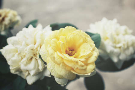 yellow roses in garden, top view with dark blurred garden background, selective focus on the center rose