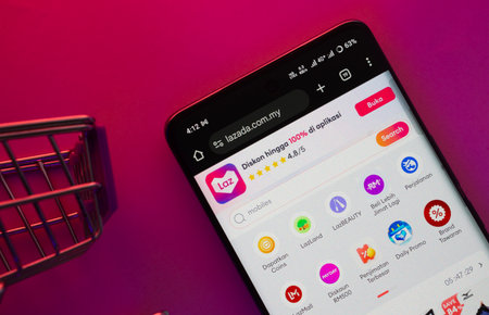Dhaka, Bangladesh- 23 June 2025: A smartphone displaying the Lazada website with a shopping cart is shown on a vibrant background.