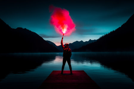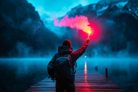 A person with backpack stands on dock, holding red smoke flare against serene lake backdrop. mountains and twilight sky create dramatic atmosphere