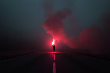 Protester holding a red flare standing in the middle of an empty road at night, during a foggy and evocative atmosphere