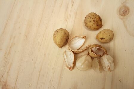Longan Fresh Dimocarpus longan. A bunch of Longan and Peel show the white meat with black seed was placed on a wooden background.