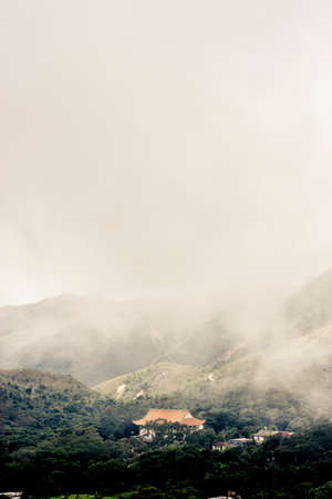 Historic building in fog, at Ngong Ping, Lantau Island, Hong Kong.