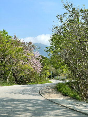 The vertical pink flowers and green trees near the curve road with shadow