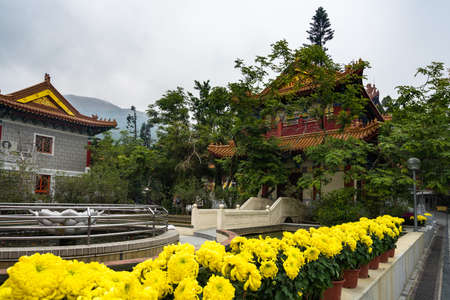 A beautiful shot of Po Lin Monastery in Lantau, Hong Kong surrounded by trees and yellow flowers