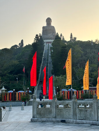 Big Buddha statue and red flags in the park at sunset, located at Ngong Ping, near Po Lin Monastery on Lantau Island, Hong Kong.