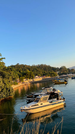A tranquil coastal panorama showcasing calm waters, numerous boats,