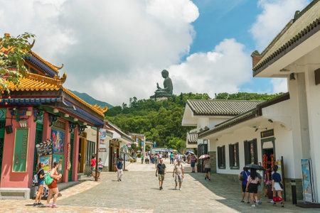 Hong Kong, China - July 26, 2019 : Tian Tan Buddha aka the Big Buddha is a large bronze statue of a Sakyamuni Buddha and located at Ngong Ping, Lantau Island in Hong Kong