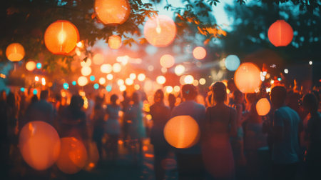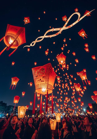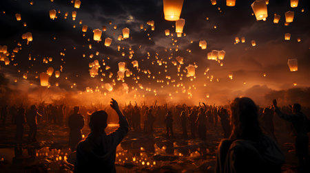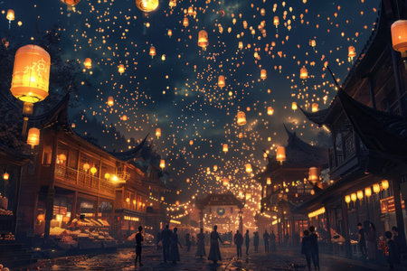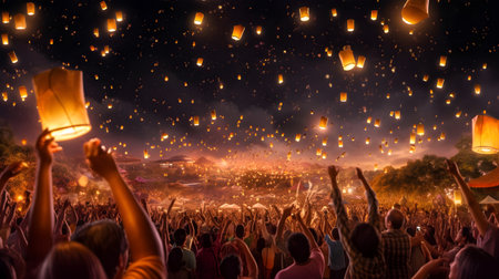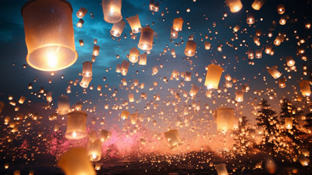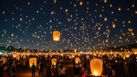 Enchanting scene of floating lanterns illuminating the night sky during a festive celebration, creating a magical atmosphere filled with light and serenity.