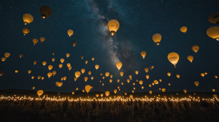 A stunning view of numerous hot air balloons rising against a clear night sky filled with the Milky Way, creating an enchanting and serene landscape.