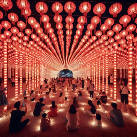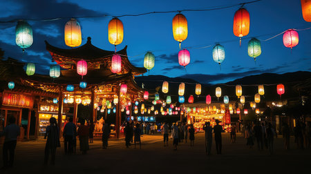A colorful array of lanterns lights up a lively marketplace during a traditional evening festival, creating a stunning atmosphere filled with culture and joy.