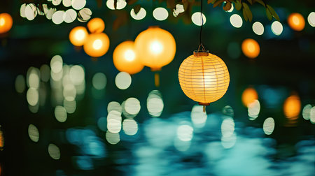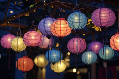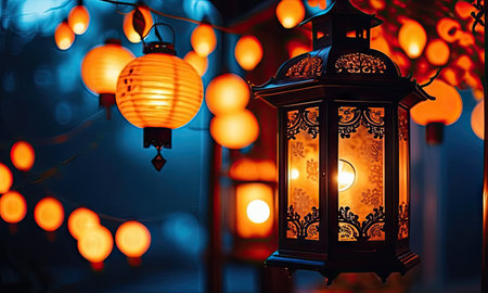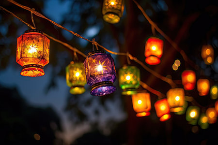 A line of illuminated lanterns hangs against a blurred background, creating a warm, inviting atmosphere. The scene features a variety of lantern designs and soft, golden light. This image is suitable for a range of commercial applications, including editorial content and design projects.
