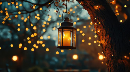 A cozy lantern hangs on a tree, surrounded by glowing bokeh lights, creating a warm and inviting atmosphere in the evening. Perfect for peaceful moments.